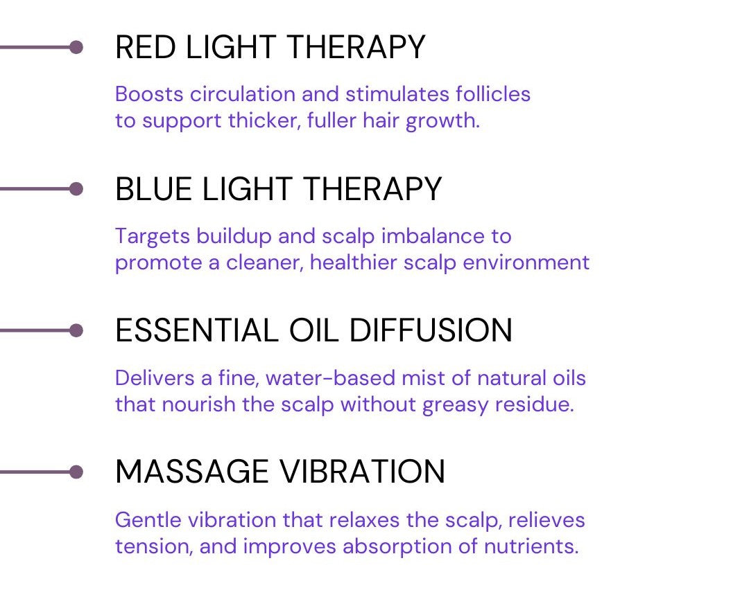 Massage Vibration Therapy: Enhances circulation and reduces tension, delivering nutrients to the roots while helping relax the scalp.