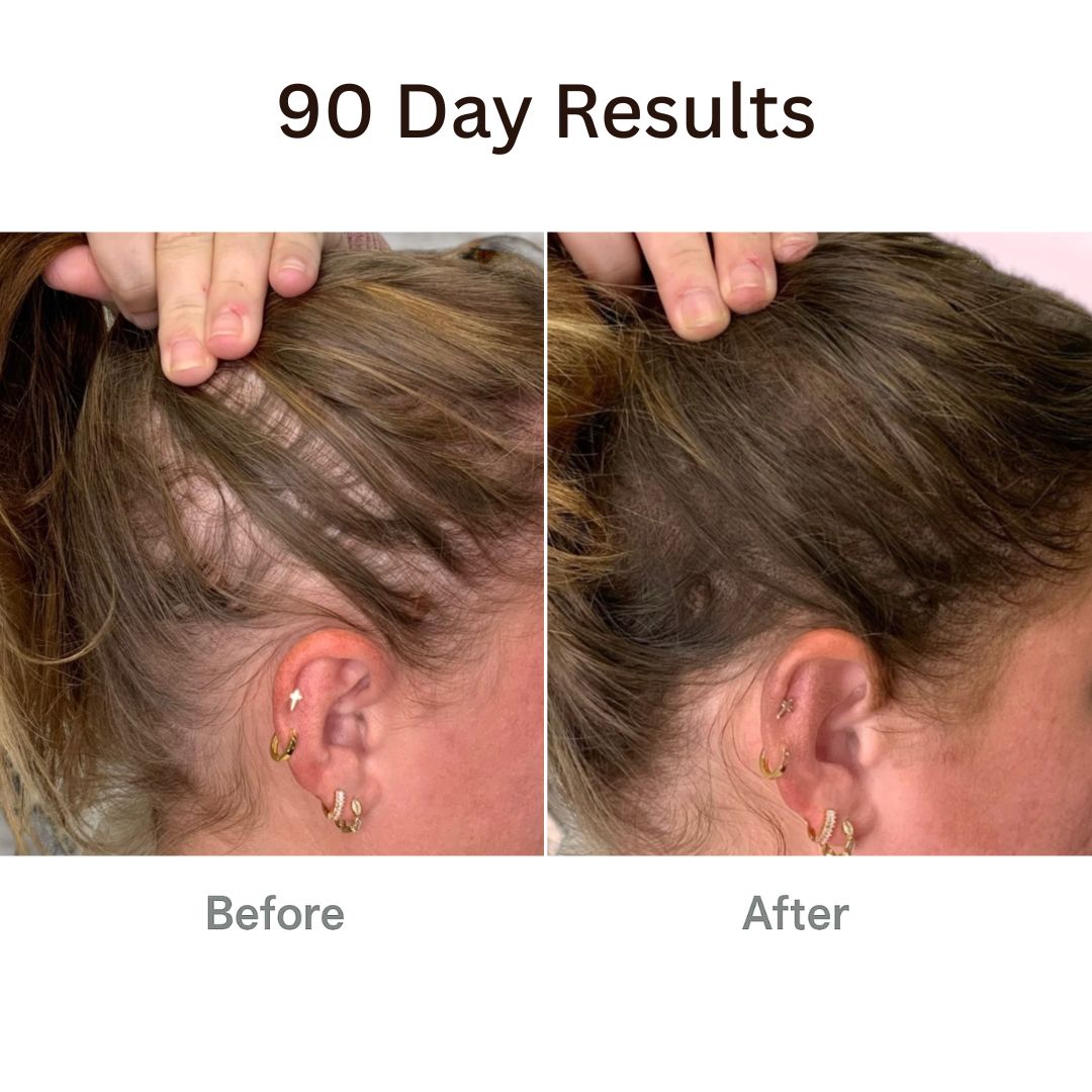 Day 90: Visible changes in hair density, fuller growth along the hairline and part, and a healthier overall appearance.